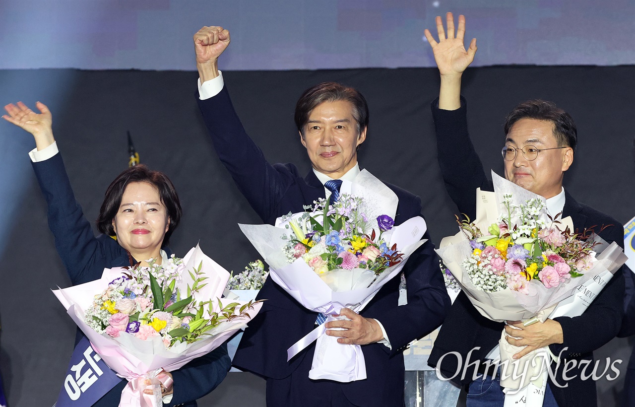 조국 조국혁신당 신임 당대표가 23일 청주 오스코에서 열린 전당대회에서 신장식, 정춘생 신임 최고위원과 함께 인사하고 있다.