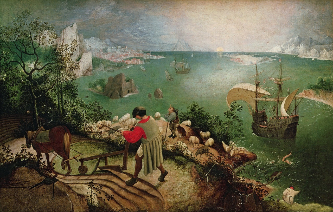 브뤼헐은 신화의 비극에서 교훈을 끌어내기보다, 비극을 외면하는 사람들의 일상을 그리고 싶었던 듯하다. 이카로스에게 추락은 비극이지만, 다른 이들에게는 그저 사소한 일에 불과했다. 범선은 항해를 계속했고, 농부는 밭을 갈았으며, 목동은 양을 지켰고, 어부는 낚싯줄을 놓지 않았다. 이카로스는 바다로 사라졌지만, 세상은 여전히 잘 돌아갔다.