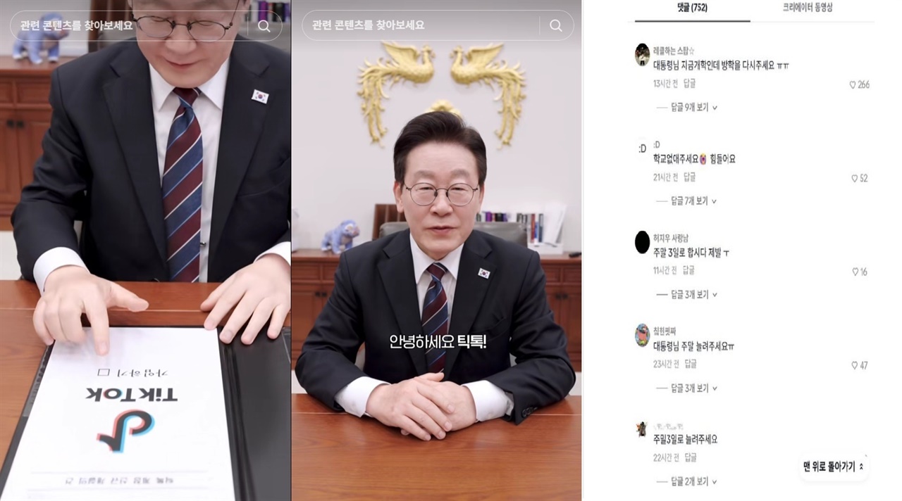 아니나 다를까. 이 대통령의 계정에는 청소년들의 아우성이 빗발치고 있다. "대통령님 지금 개학인데 방학을 다시 주세요", "대통령님 주말을 늘려주세요", "학교 없애주세요 힘들어요" 등 엉뚱하고 솔직한 댓글들이 달리고 있다.