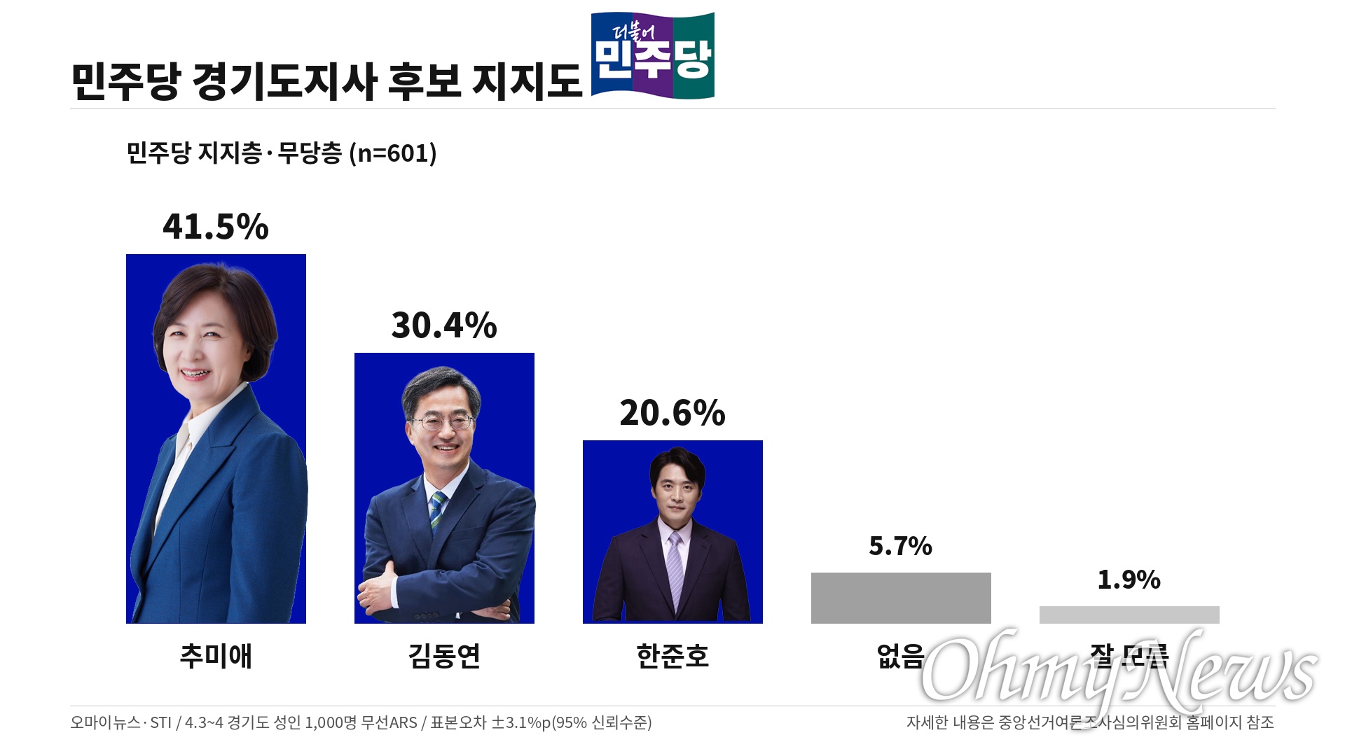 - 비호감도 : 김동연 12.9% 추미애 34.5% 한준호 10.7% 없음 18.2% 잘 모름 23.7%